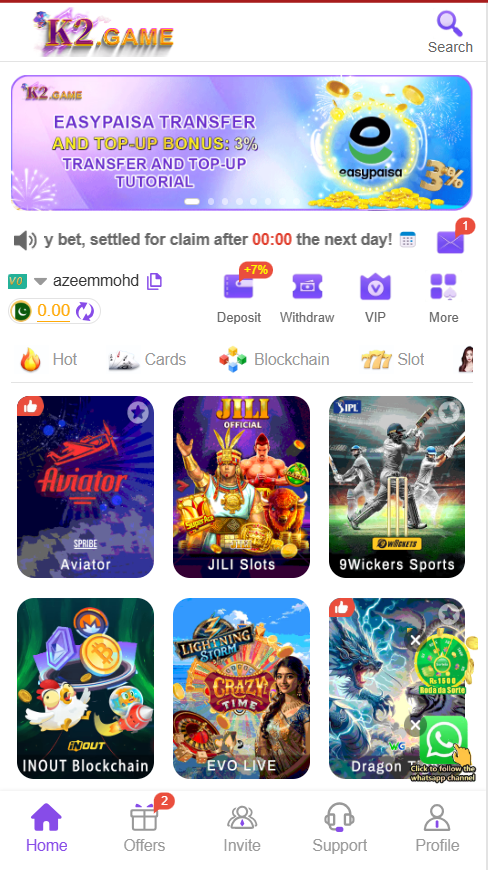 K2 Game supports Easypaisa, JazzCash, and bank transfers. To complete the transaction, simply enter the amount in the deposit section.